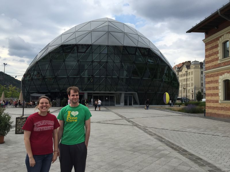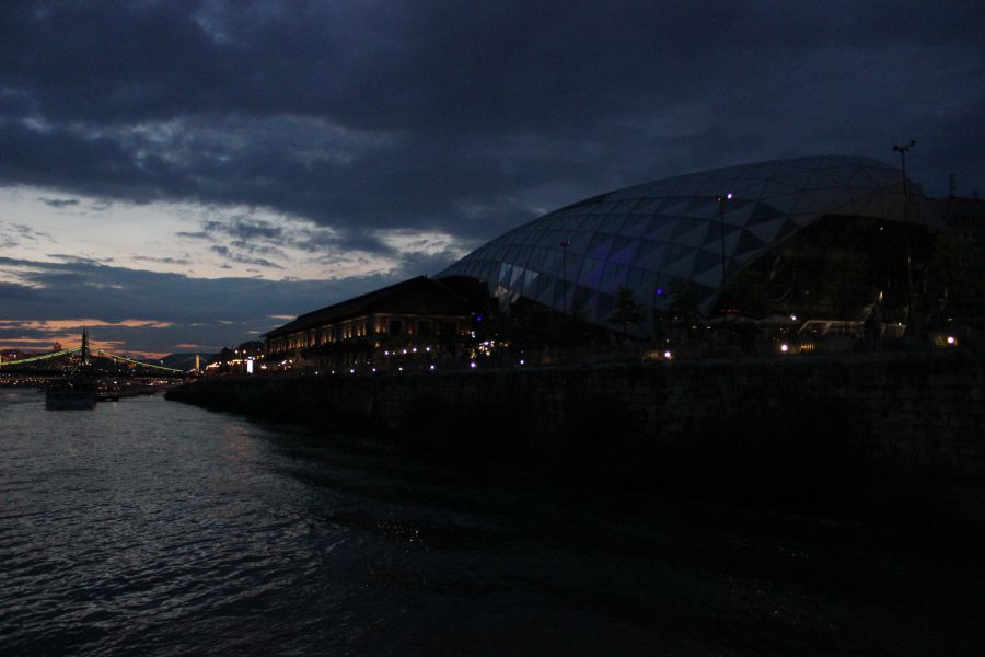 On the riverbank in Budapest, Madeleine and Joel prepare to enter "the Whale", a modern shopping center vaguely reminiscent of... well... a whale.
