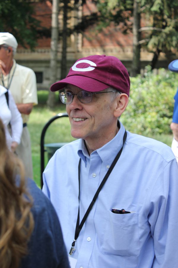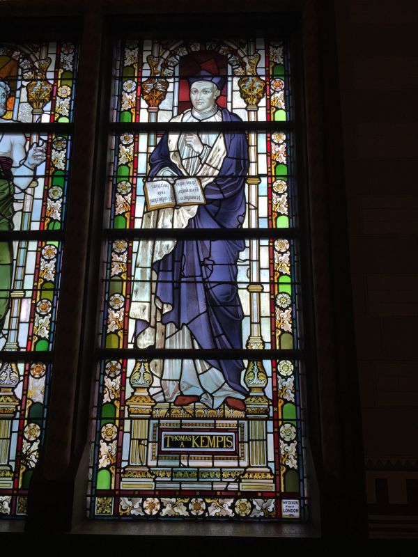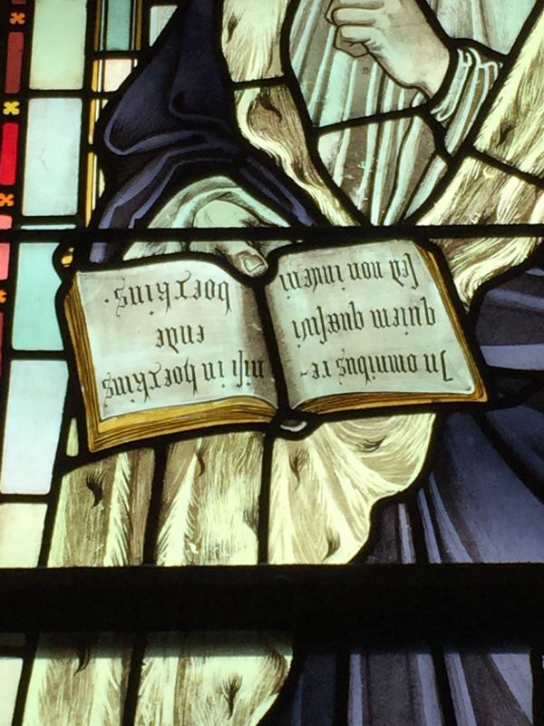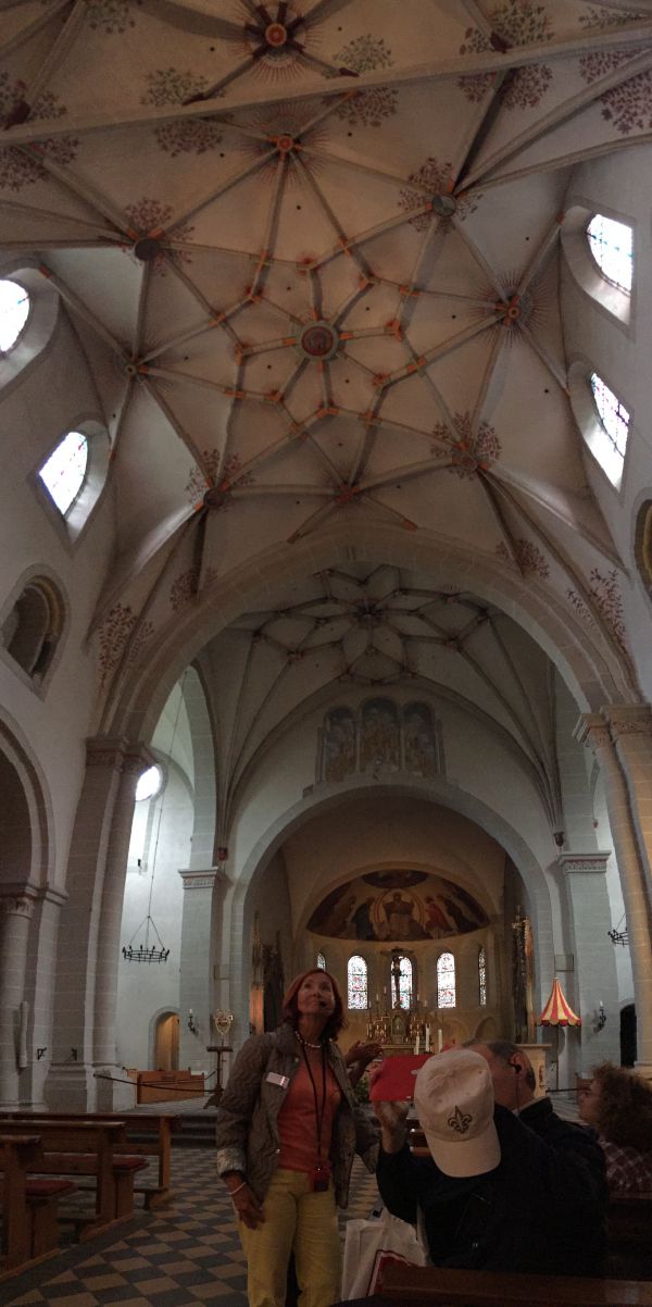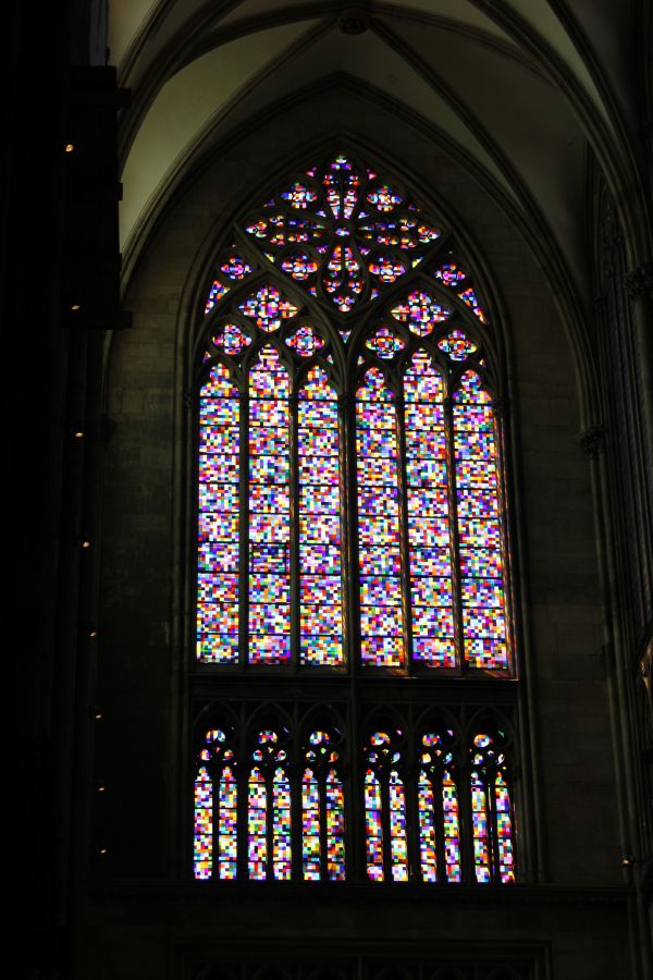 a modern stained-glass window that apparently caused quite a stir for being a confetti-like mosaic of colored squares. Supposedly the placement and color of the squares is not as random as it would seem. We were told there was some kind of left-right symmetry in the two halves of the window. I asked for further clarification on this, but I could never see what they were talking about. But I like the window anyway.