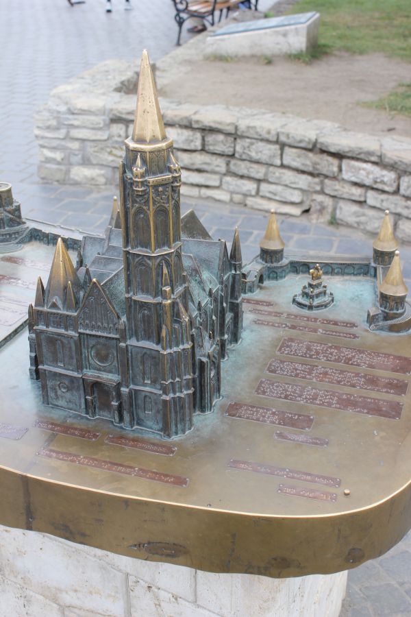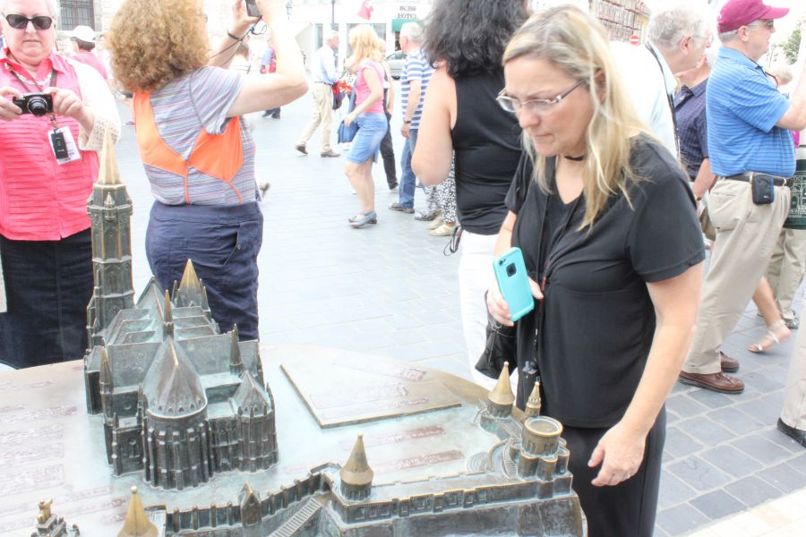One of the sign interpreters on our trip looking at the model of St. Stephen's Cathedral and the Buda city walls.