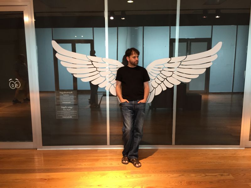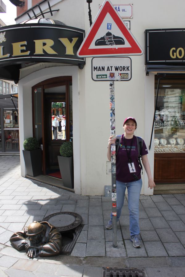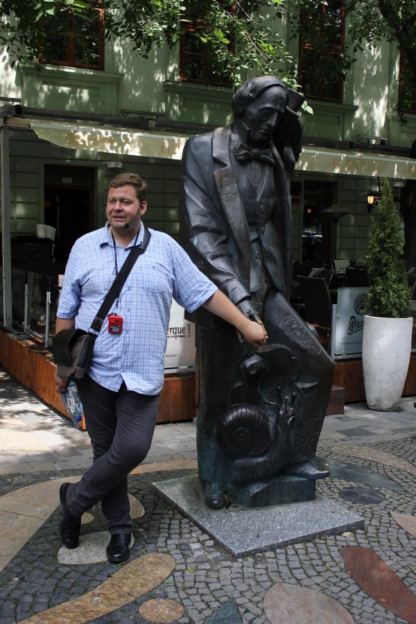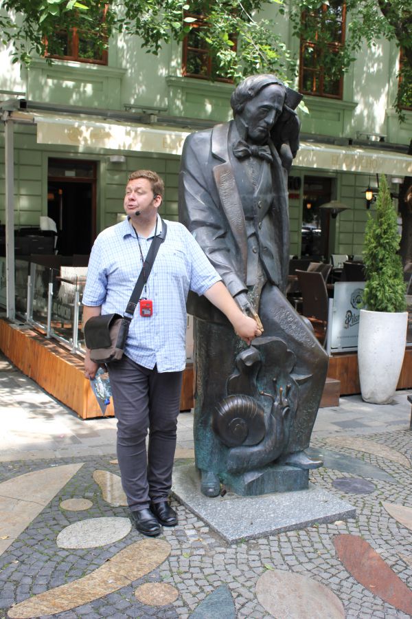 Our tour guide in Bratislava with their statue of Hans Christian Anderson, the children's fairytales author. Different objects on the statue stand for different parts in the stories he wrote.