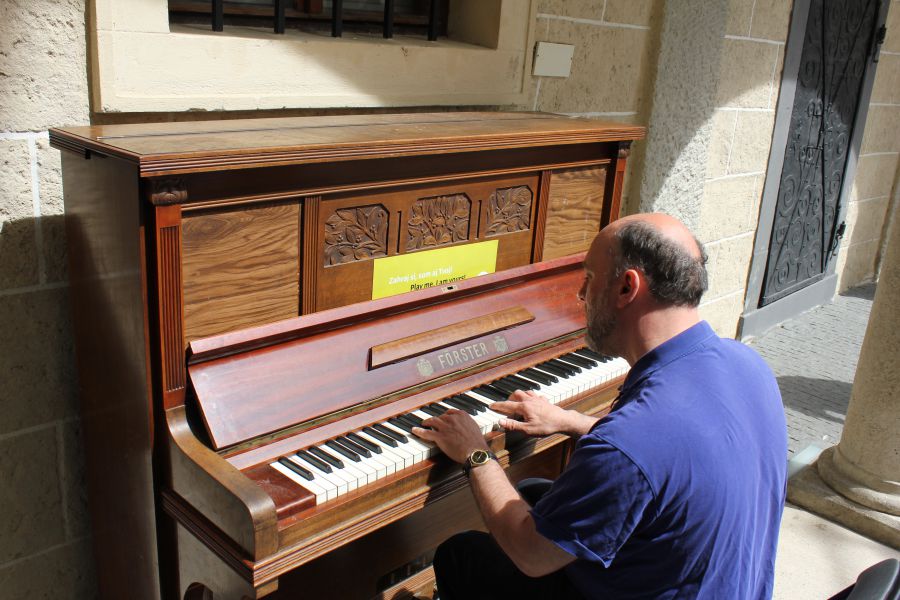 In a courtyard in Bratislava, they have a community piano, where anyone can come and play for all to hear at any time. This man was playing the jazz standard "Blue Skies".