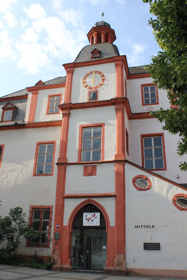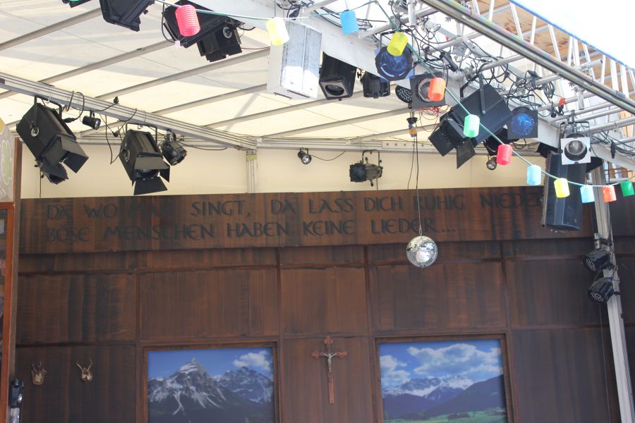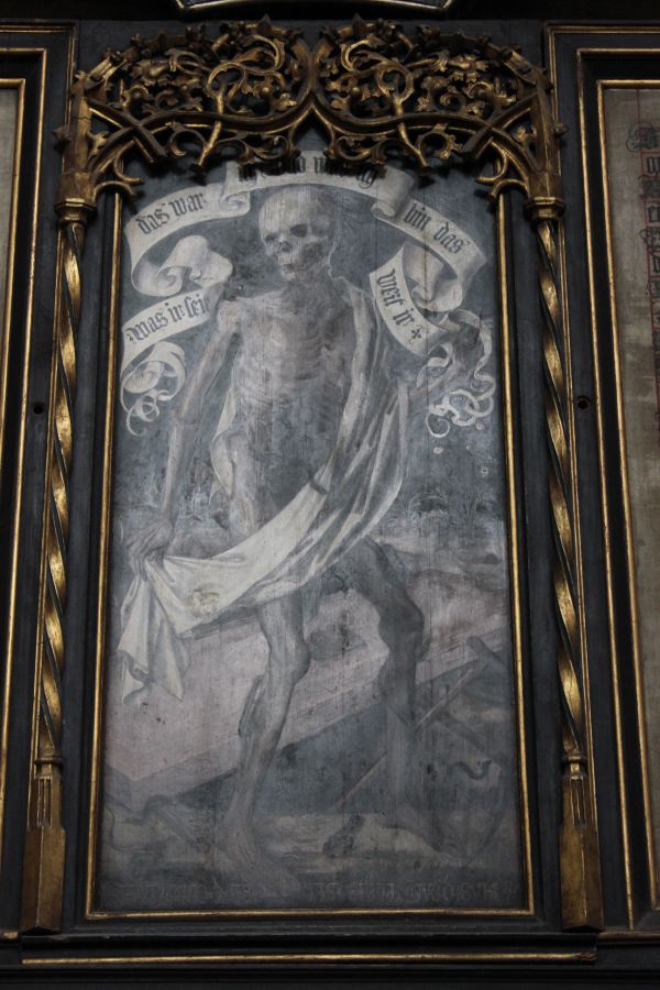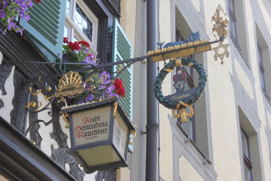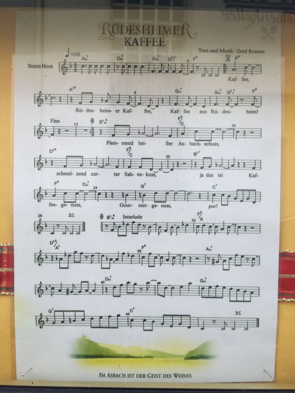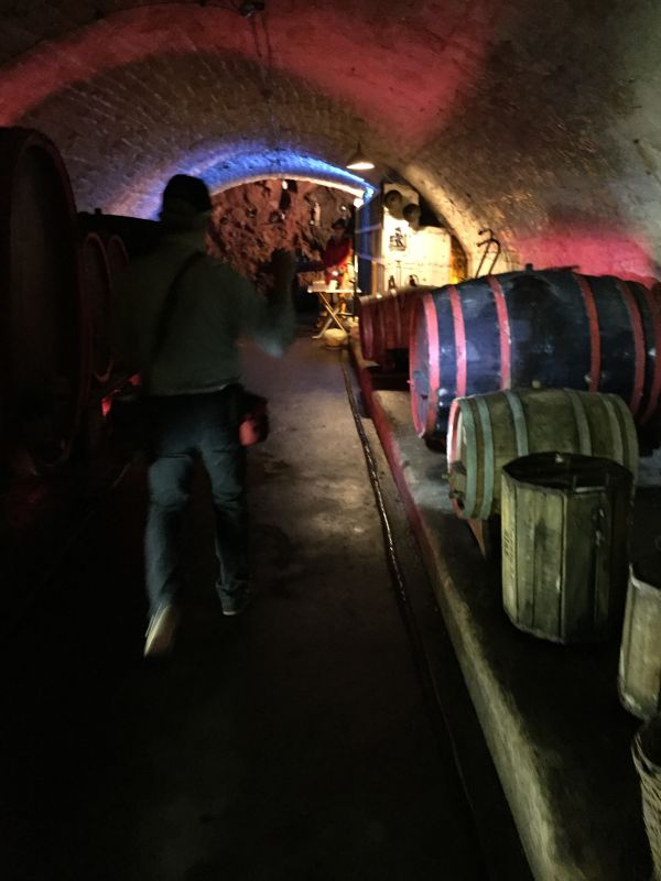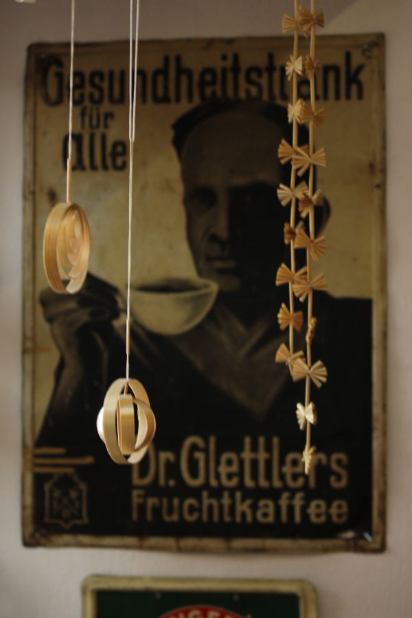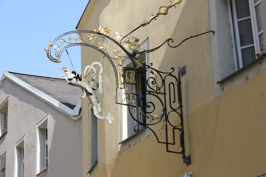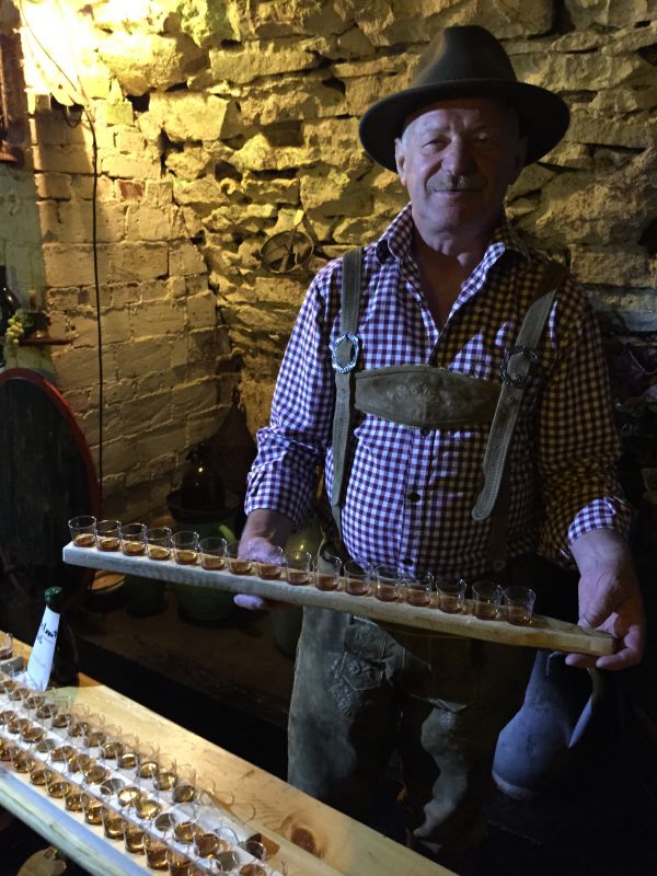 A painted memorial to the brewery's/winery's founder. The text in the banner might be translated as: "With feeling we remember him always; his wine puts us in a light and happy mood; it helped him reach an advanced age; he was our founder and remained manager until his dying day". (It rhymes in German).