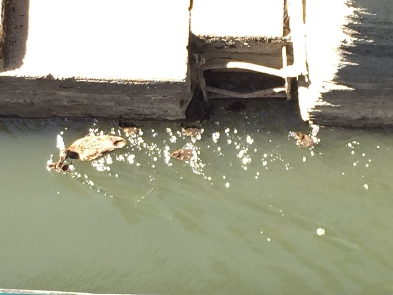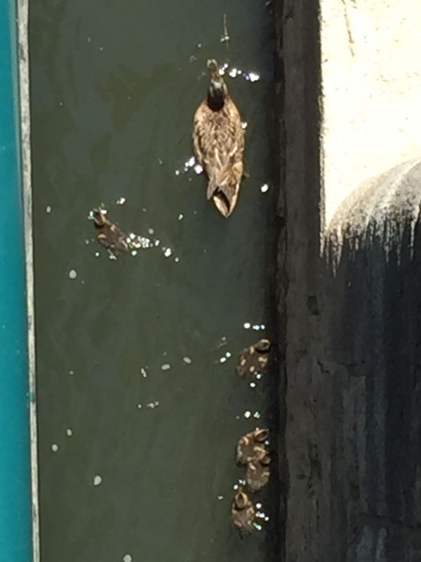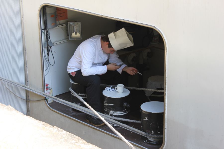 A kitchen staff member of another boat checks his phone during a brief pause in his duties. He happened to be sitting in this little dockside window.