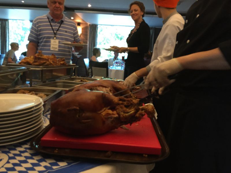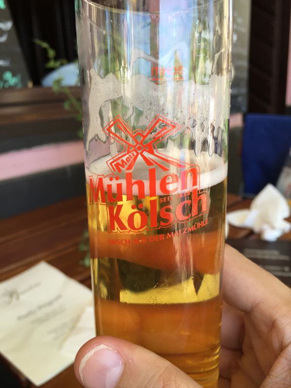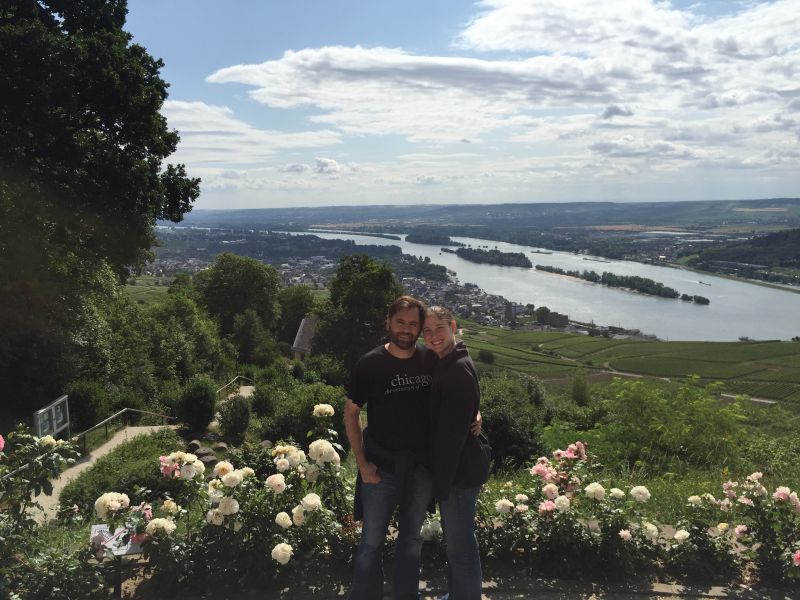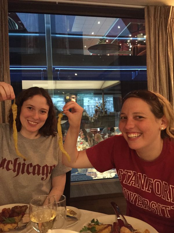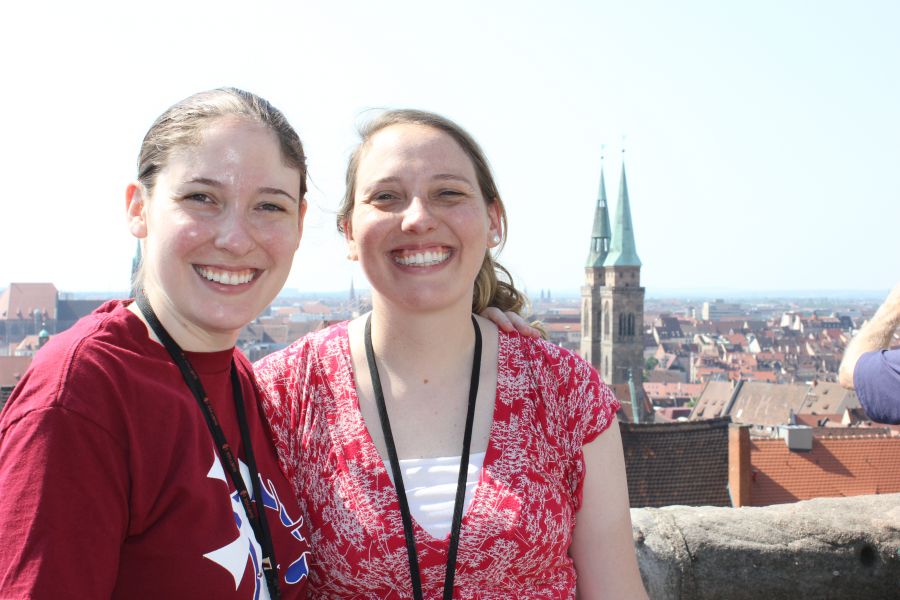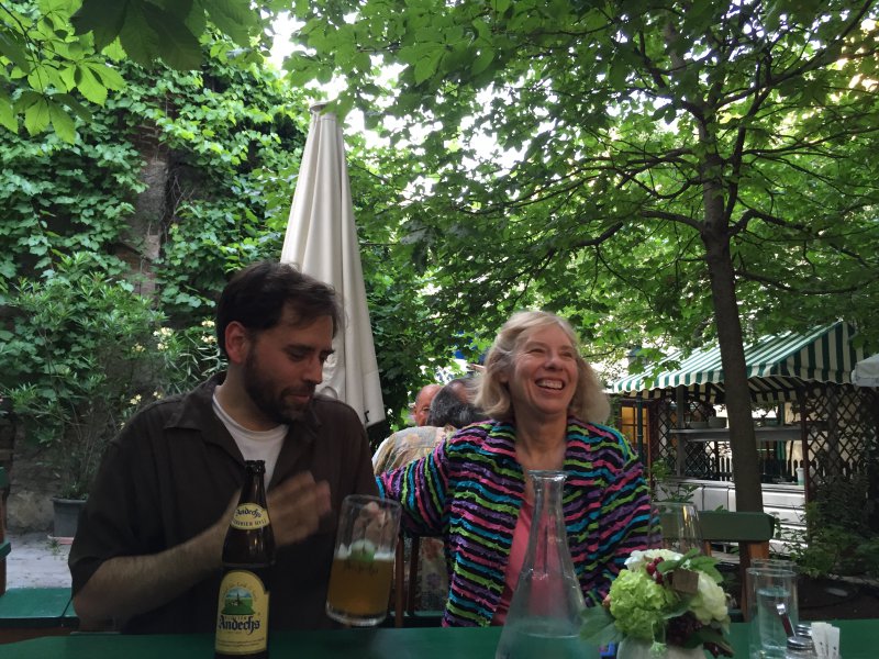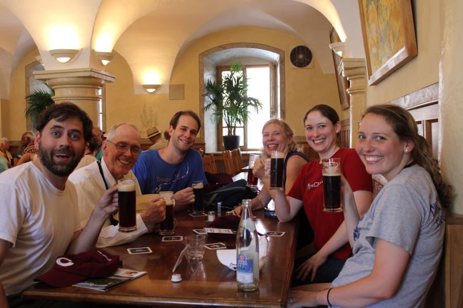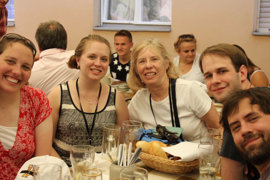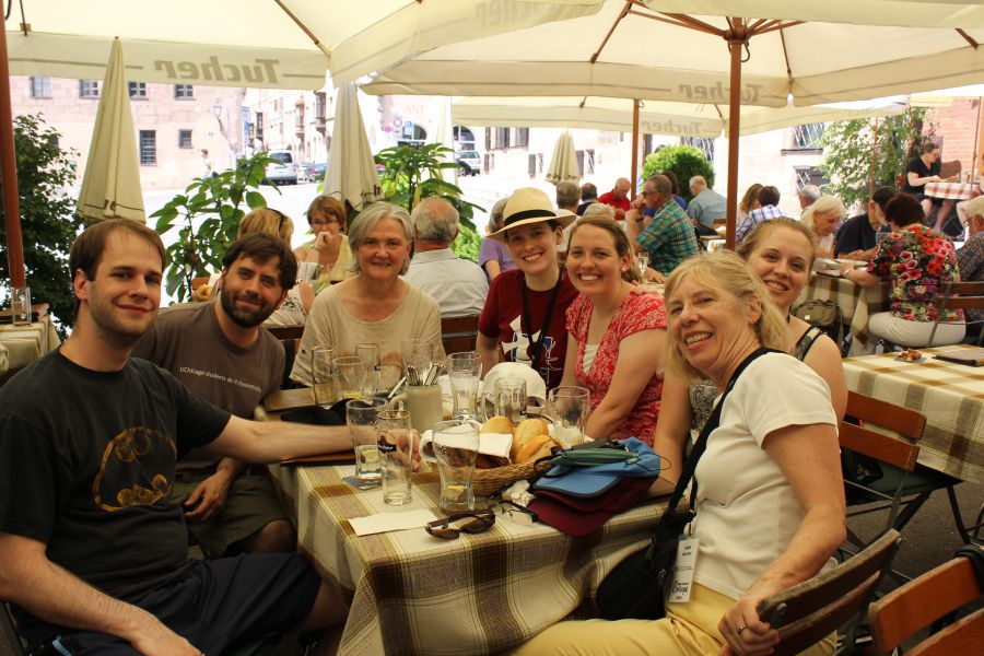 Lunch in Nuremberg, Germany: traditional bratwurst sausages, potato salad or sauerkraut, and beer. In the photo from left to right: Madeleine, Theresa (the UChicago alumni representative on the trip), Mama, Joel, and Noel.