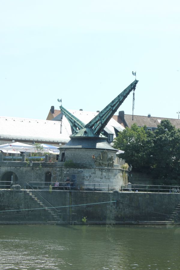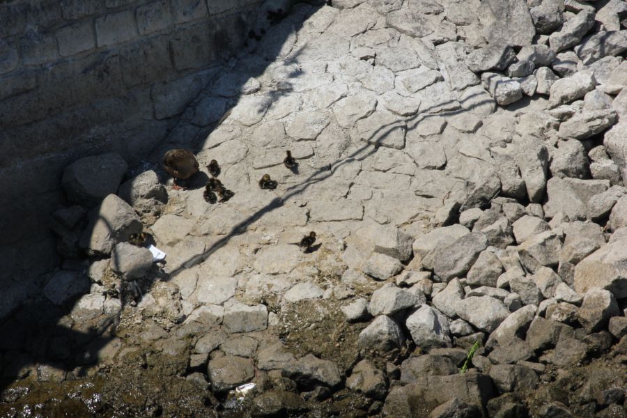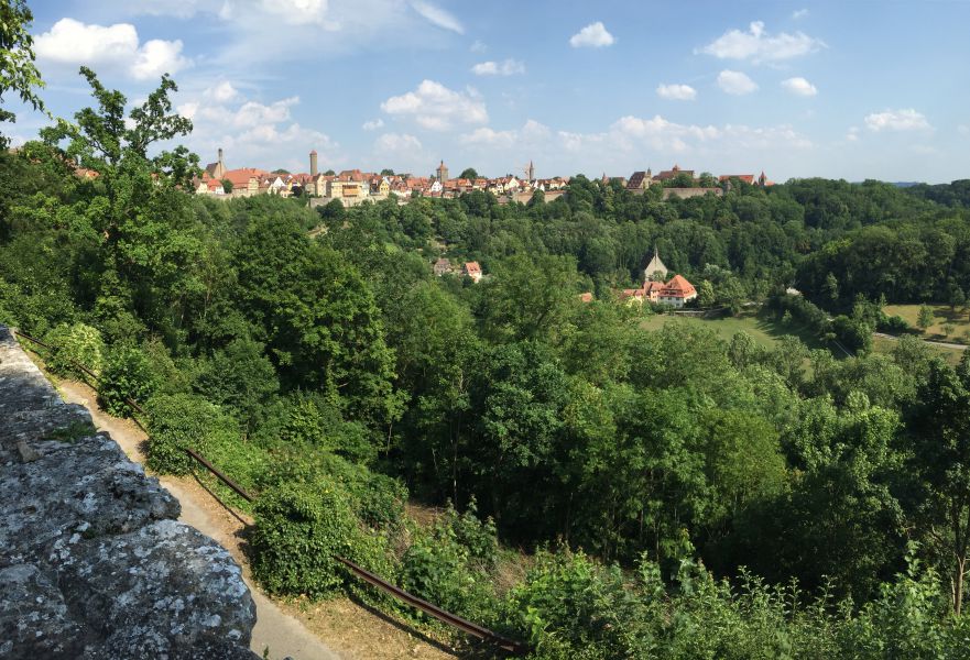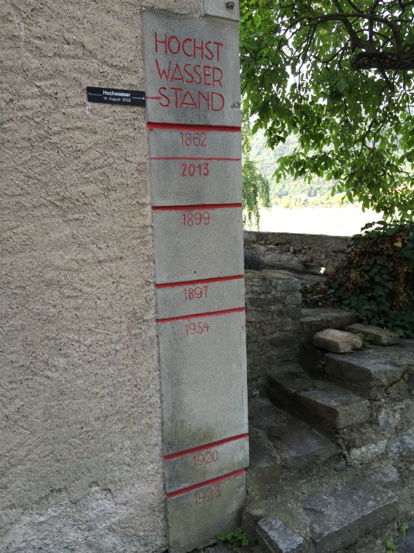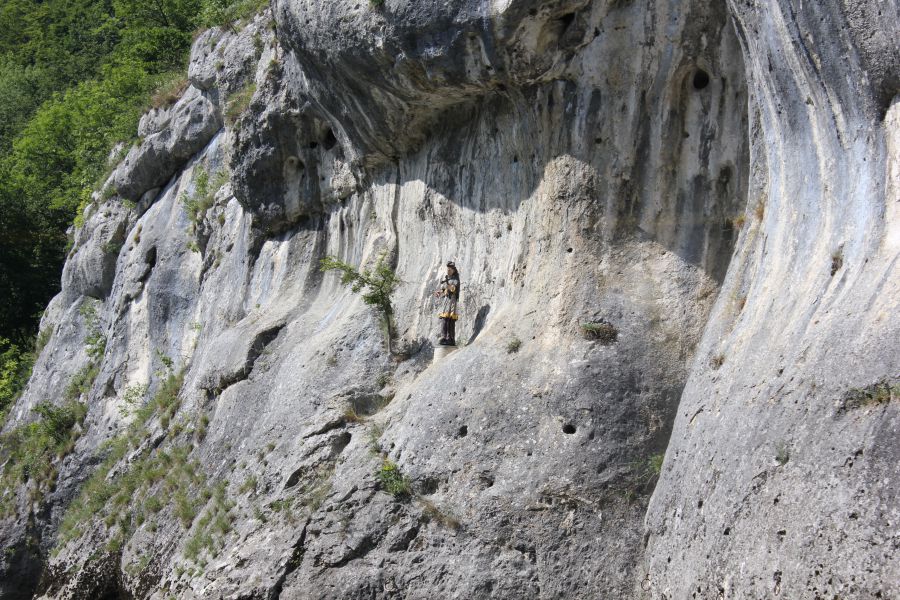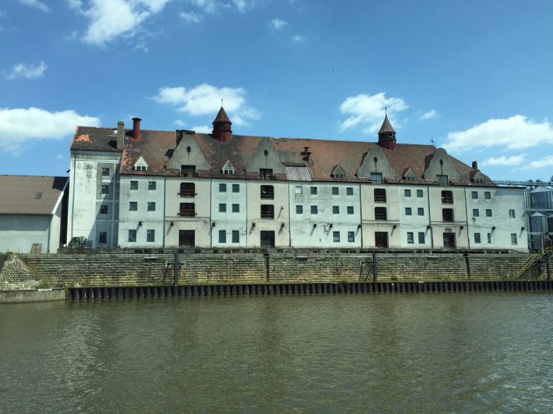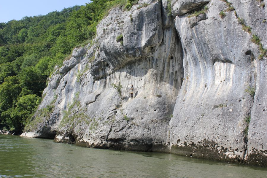 A statue of Nepomuk is barely visible in the middle of this cliff face, taken from the boat on our journey away from the inferno that was Regensburg.