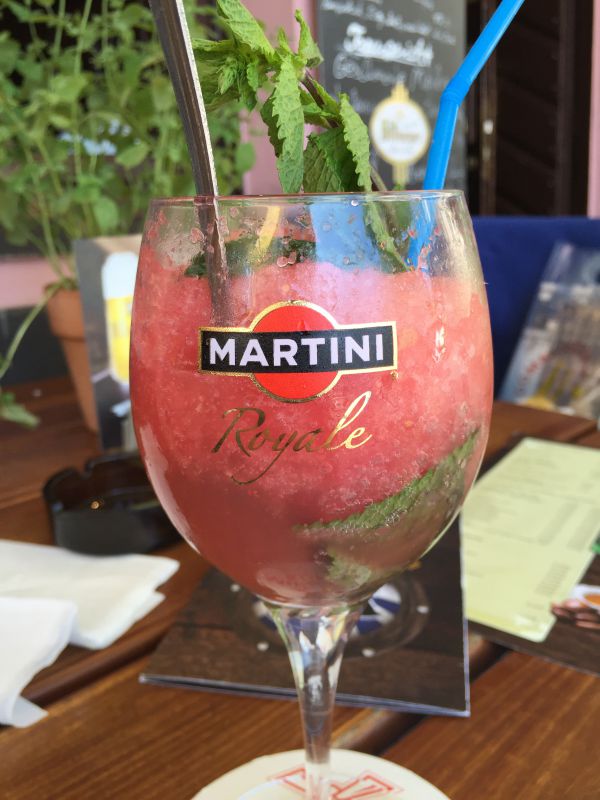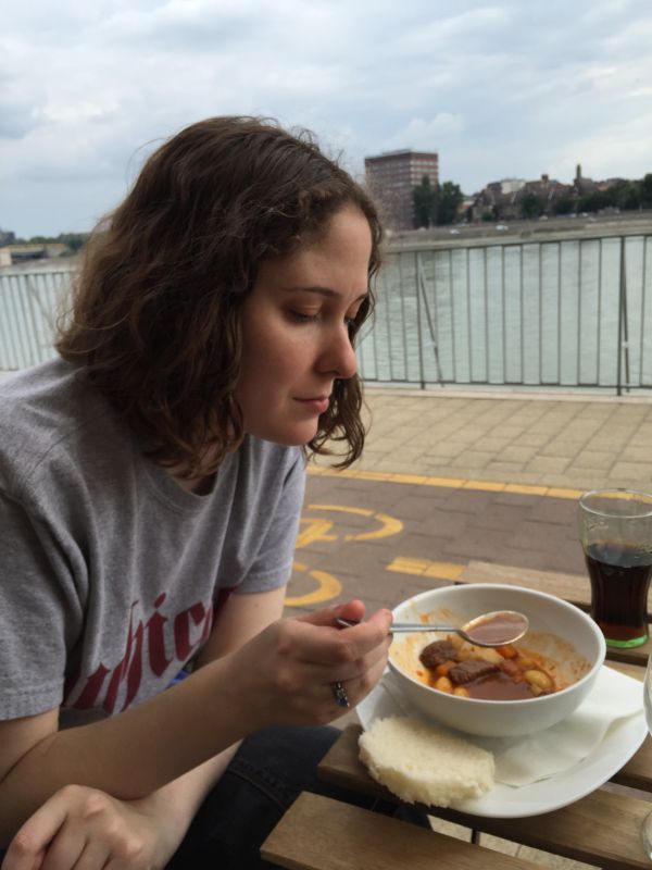 Margie eats authentic Hungarian goulash in a surprisingly affordable restaurant in the Whale (with outside seating).