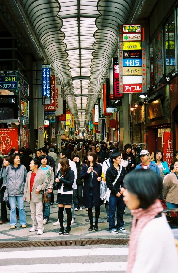 Shooting into one of the many covered shopping arcades in Namba, Osaka's sprawling entertainment and nightlife district.