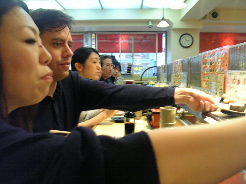 When we got back to Tokyo I went out with Ben and Kumie for some more delicious sushi, this time of a higher quality than at the conveyor belt place. I had been dismayed to learn that the Japanese do not dissolve large chunks of wasabi in their soy sauce, and that in general it is considered uncouth to add extra wasabi to the sushi that the chef has taken the trouble of preparing. Kumie did not understand my desire to do this, but I was determined. You can see the results in a movie here. My chopstick technique failed me, but my ability to eat wasabi did not.