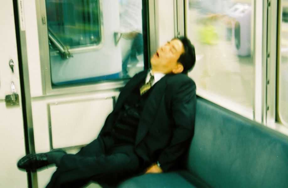 Late nights and early mornings were too much for this Osaka businessman. He probably missed his meeting, as this stop was at the end of the line.