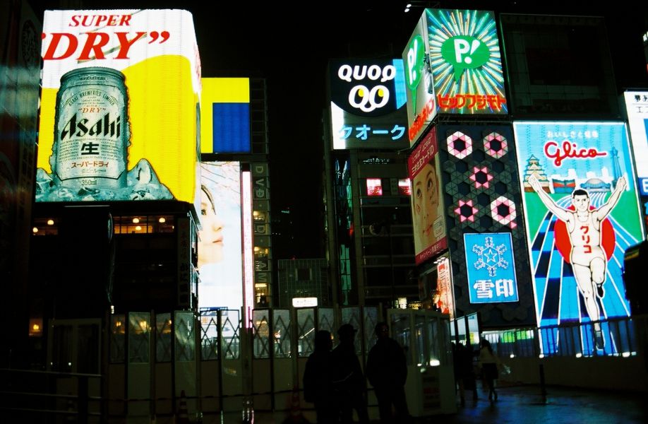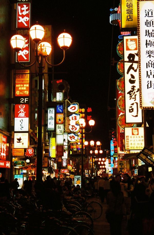 Osaka at night again. The center of this city, of Tokyo, and presumably of other Japanese cities, are lit from top to bottom with flashing animated advertisements. It's completely mad, but thrilling.