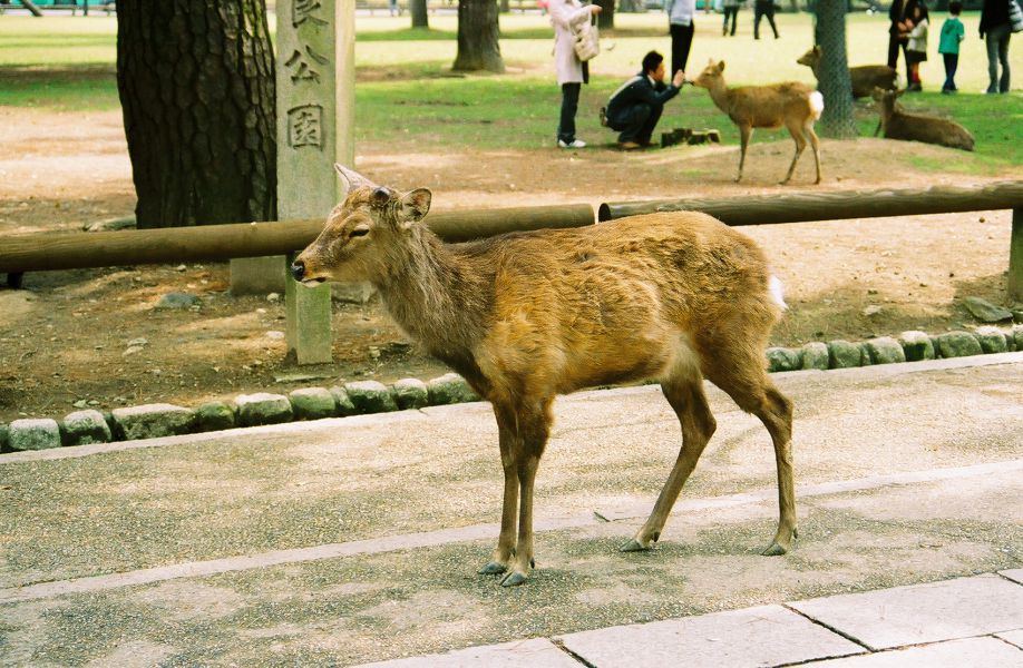 The Nara deer have been taught to bow in the Japanese manner. In the movie you can watch here, I lose my tourist literature as I try to bribe a deer into bowing with my remaining wafers.
