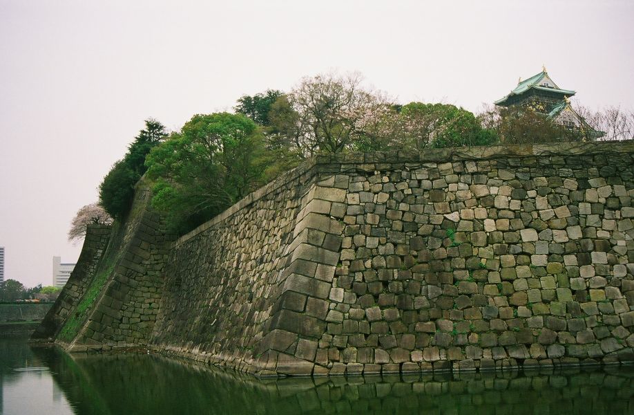 The walls of Osaka castle. This sloping design is typical of Japanese castle construction, according to some a defense against earthquakes.