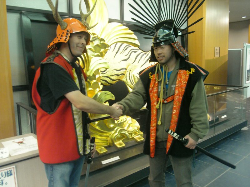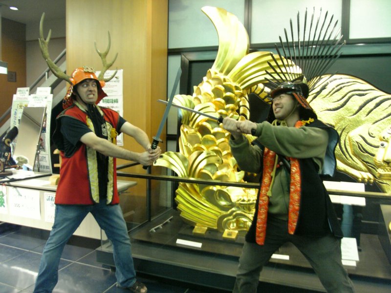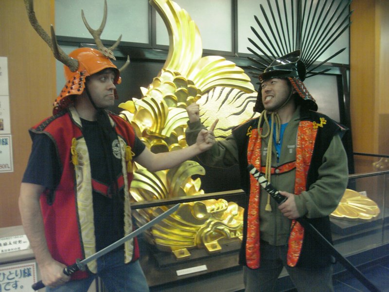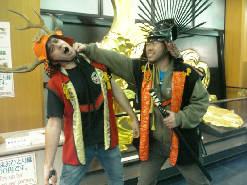 On the bottom floor, right before the exit, are some recreated helmets and weapons you can try on and get photographed in. Here I am battling a wandering Japanese tourist named Hime.