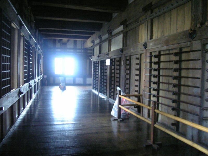 The inside of Osaka castle is a thoroughly modern museum and has nothing to do architecturally with ancient Japan. When you go inside, you start by riding an elevator to the top, and then work your way down floor by floor. Each floor is given over to some historical theme. On one floor you will find helmets and armor, another has swords, another has a sort of episodic video history of the castle that is viewed piece by piece as you trace the inner perimeter of the building. Generally you're not allowed to photograph anything.