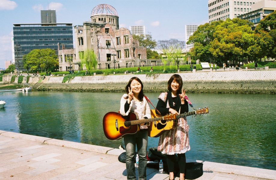 Two j-folk strumming peaceniks in front of the atomic bomb dome. When I first asked to take their picture they were very excited and energetic. I then had to struggle an eternity with my faulty camera, however, and by the time I finally got the shot off their enthusiasm had flagged a little. They were very patient with me, however, and still threw up a good V-sign, which everyone in Japan seems to do when being photographed. A possible explanation for this custom is here.