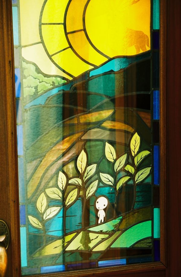A stained-glass window featuring a "kodama" tree sprite from "Princess Mononoke".